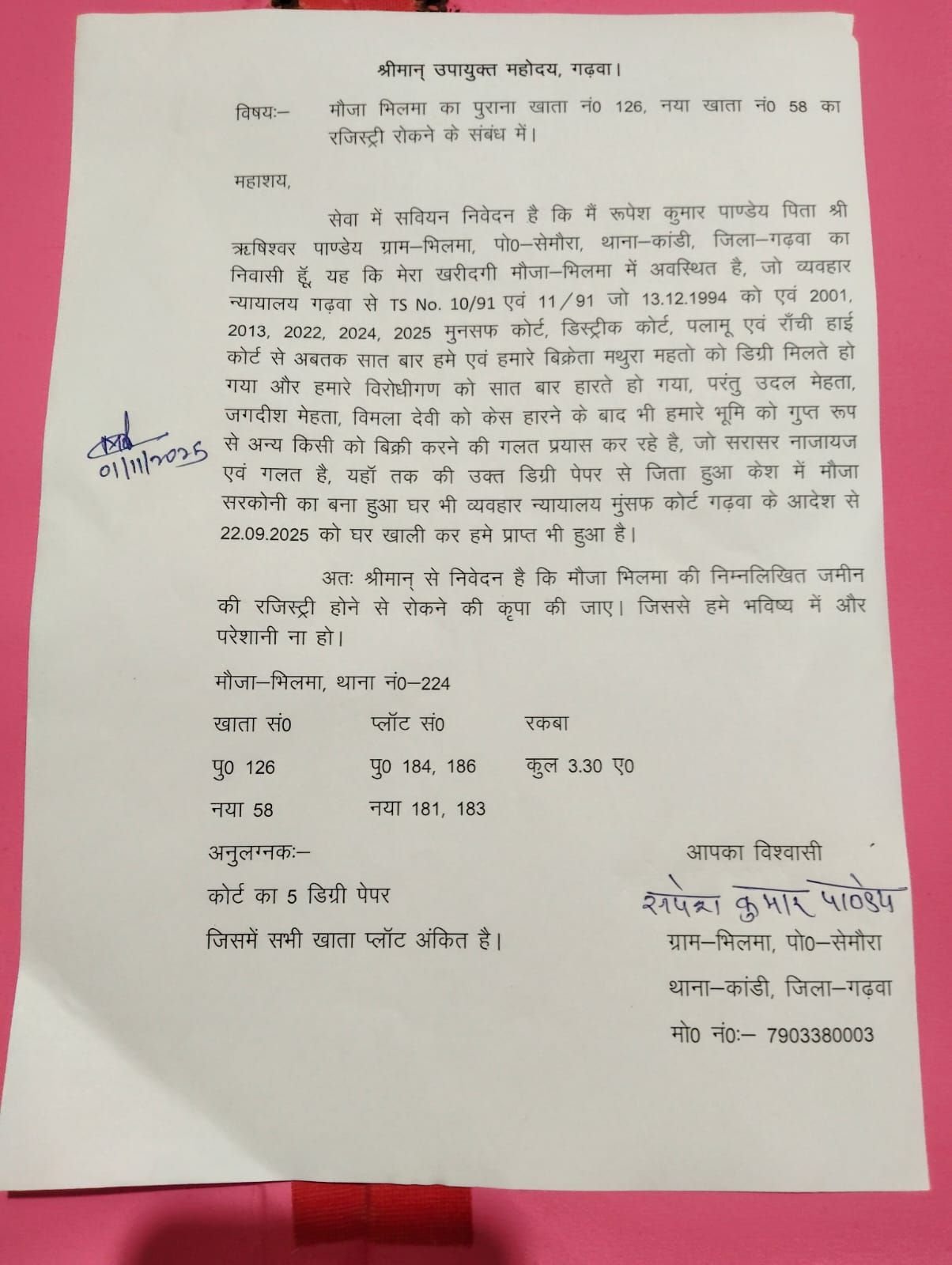 डीसी को दिए आवेदन में कहा गया है कि व्यवहार न्यायालय गढ़वा के टीएस नम्बर 10/91 एवं 11/91 जो 1994 ,2001,2013,2022 ,2024 तथा 2025 में मुनसफ़ कोर्ट,जिला न्यायालय पलामू व हाई कोर्ट रांची से अबतक सात बार हमें और हमारे विक्रेता मथुरा महतो को डिग्री मिलते हो गया है।हमारे विरोधी उदल मेहता,जगदीश मेहता व बिमला देवी केस हारने के बाद भी गलत तरीके से मेरे जमीन को बिक्री करने का प्रयास कर रहे हैं जो सरासर नजायज और गलत है। रूपेश पाण्डेय ने आवेदन देकर उक्त जमीन की रजिस्ट्री नही होने देने की गुहार लगाया है।
