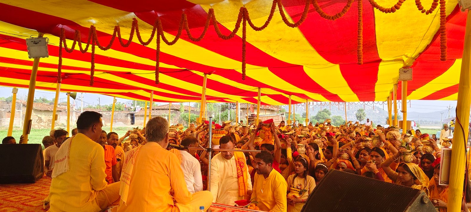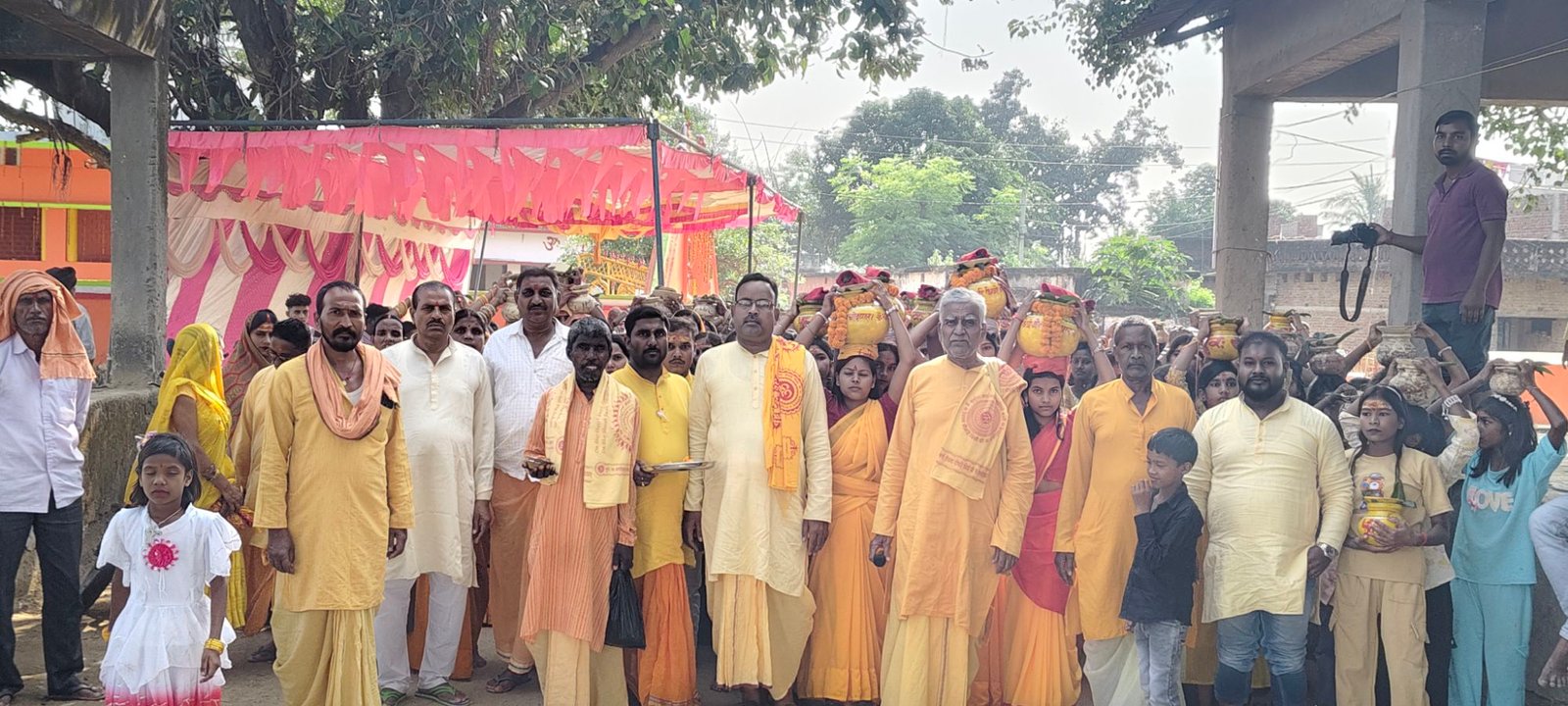 यह कार्यक्रम गांव के सूर्य मंदिर के समीप किया जा रहा है। कार्यक्रम में आए विद्वान पंडित रमेश दुबे के नेतृत्व में किया जा रहा है। वहीं कार्तिक पूर्णिमा दिन बुधवार को रमेश दुबे के द्वारा वैदिक मित्रों के साथ 251 कलश यात्रा निकाली गई। यह कलश यात्रा गांव भ्रमण कर चिरकुट ही पानी टंकी घाट पहुंचीं। जहां पर उपस्थित विद्वान पंडित रमेश दुबे के द्वारा वैदिक मंत्रों उच्चारण के साथ नीतीश कमलापुरी भोले शंकर कमलापुरी एवं अभिषेक प्रसाद कमलापुरी के द्वारा पूजा अर्चना कराई गई।