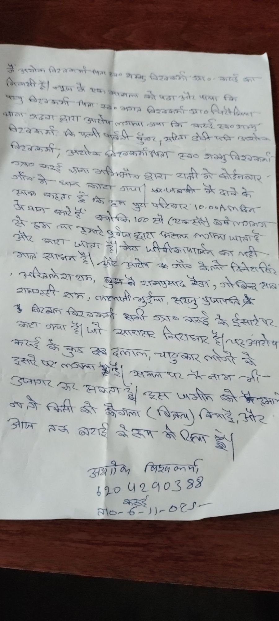 लेकिन यह सरासर गलत है। उसे जमीन में हम लोग विगत 100 वर्षों से खेती कर रहे हैं और हम लोगों का ही जोत कोड़ है। लेकिन रिश्ता को जोड़कर पच्चू विश्वकर्मा गांव के लोगों के झांसे में आकर चोरी का आरोप लगाया है और जमीन का दवा करना चाह रहे हैं यह सरासर गलत है। जबकि इस मामले में पुलिस भी जांच कर चुकी है। साथ ही अशोक विश्वकर्मा ने कहा कि यह राजनीतिक रंग देते हुए गांव के ही दिनेश सिंह, अखिलेश राम, राम प्रसाद बैठा, गोविंद साह, राम गति राम, लालजी भुइंया, सूरज प्रजापति, बीरबल विश्वकर्मा का नाम शामिल किया गया है, जबकि इस मामले में इन लोगों को कोई लेना देना नहीं है। जबकि हमारे पूर्वज से ही इस जमीन को जोत कोड़ कर रहे हैं, इन सभी ग्रामीणों को इसमें क्या मतलब है। अगर इसमें जो भी लोग राजनीतिक हैं तो जरूरत के अनुसार उन लोगों का भी नाम उजागर कर दूंगा।