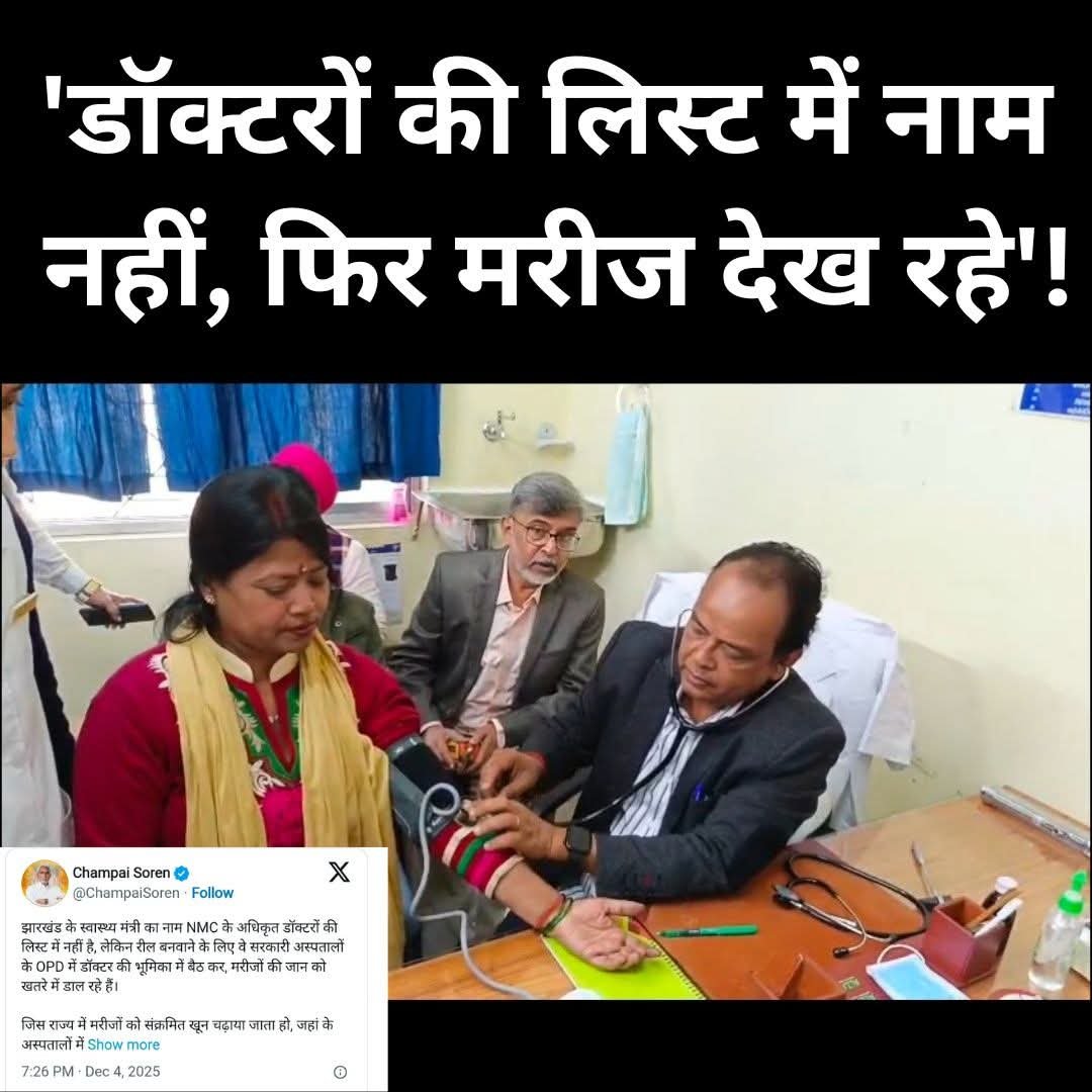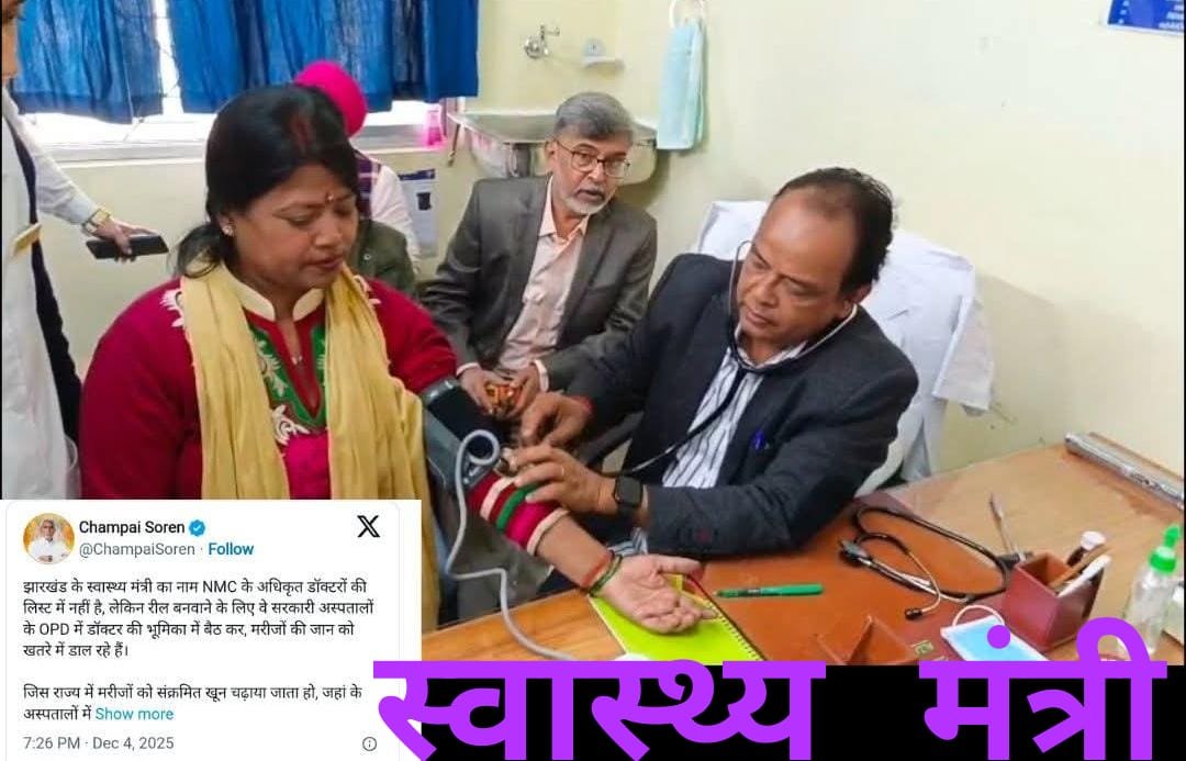 गढ़वा:झारखंड के पूर्व मुख्यमंत्री चंपई सोरेन ने वर्तमान स्वास्थ्य मंत्री इरफान अंसारी पर गंभीर आरोप लगाए हैं। सोरेन ने एक्स पर पोस्ट करते हुए कहा कि स्वास्थ्य मंत्री का नाम NMC की अधिकृत डॉक्टरों की सूची में नहीं है, फिर भी वे सरकारी अस्पतालों के OPD में डॉक्टर बनकर बैठते हैं और रील्स बनवाते हैं। उनका कहना है कि इस तरह मरीजों की जान के साथ बड़ा खिलवाड़ हो रहा है।