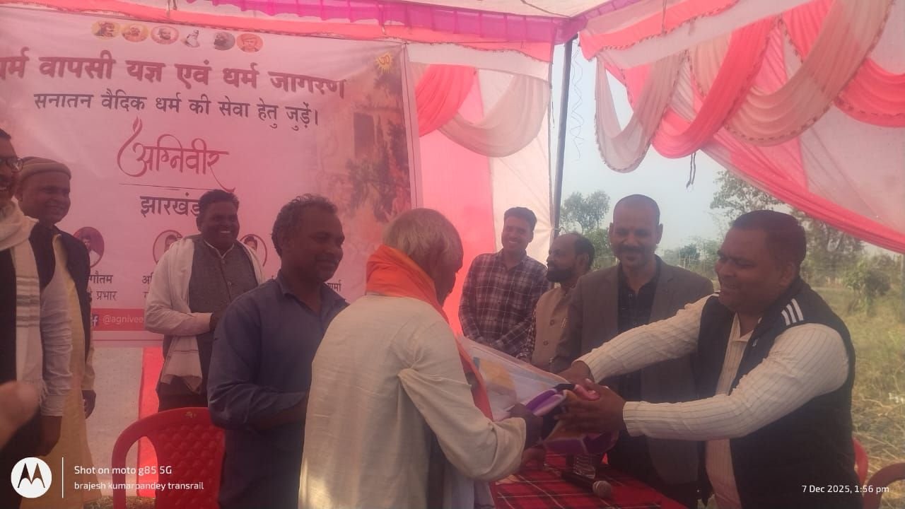 कांडी: प्रखंड क्षेत्र अंतर्गत शिवपुर पंचायत में गरदाहा उच्च विद्यालय के समीप राधे कृष्ण गौशाला में रविवार को झारखंड अग्निवीर संगठन की ओर से धर्म वापसी यज्ञ एवं धर्म जागरण यज्ञ का आयोजन किया गया। उक्त कार्यक्रम का शुभारंभ मुख्य अतिथि विधानसभा क्षेत्र के युवा समाजसेवी विकास दुबे के द्वारा किया गया। वहीं इस कार्यक्रम के दौरान अग्निवीर संगठन झारखंड के प्रमुख अधिवक्ता अमितेश चौबे के द्वारा मौजूद सभी लोगों को अंग वस्त्र देकर सम्मानित किया गया। इसी कार्यक्रम के दौरान ठंड से बचाव हेतु गरीब असहाय बुजुर्गों के बीच गर्म कपड़े भी वितरण किये गए।