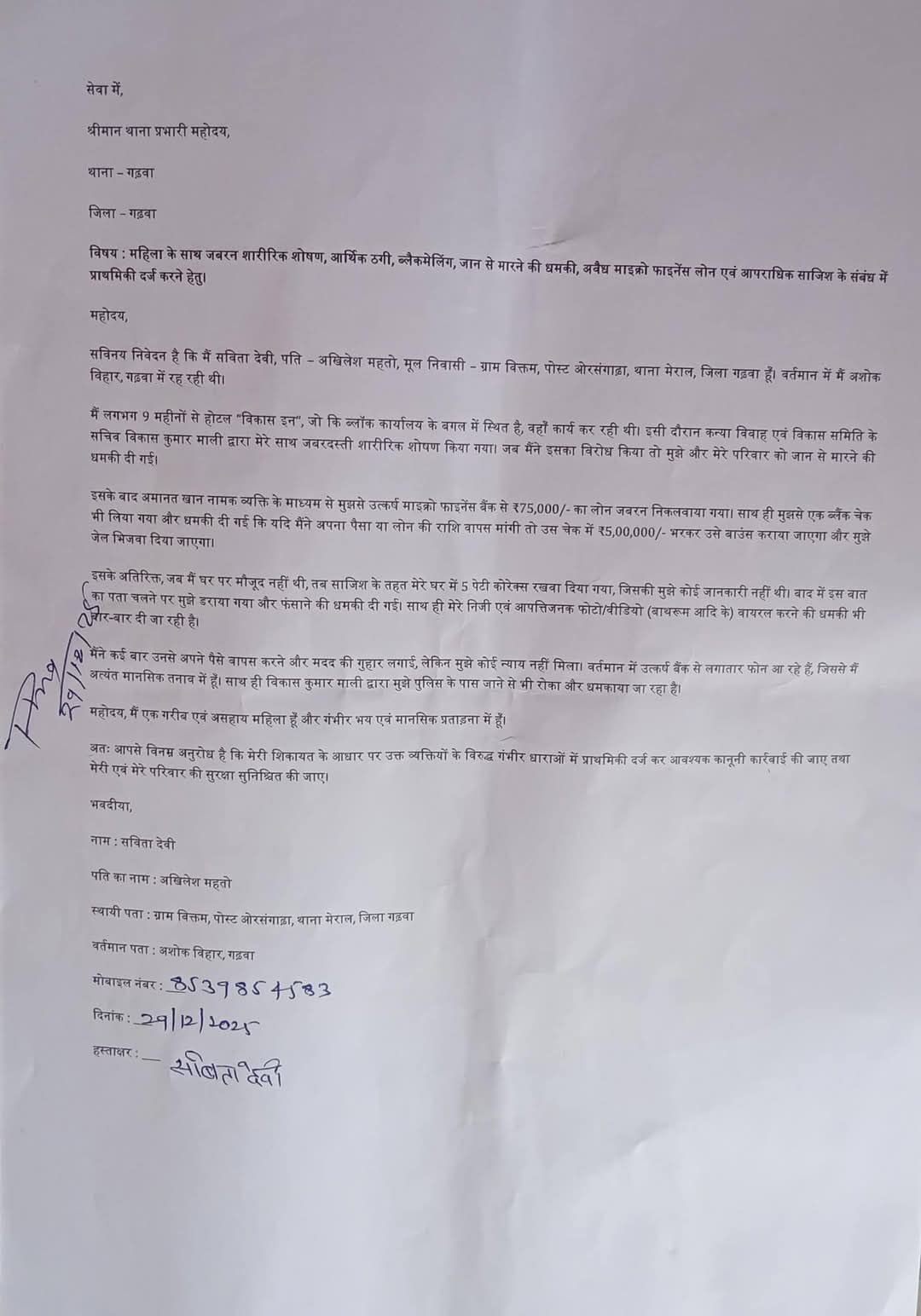 इसके बाद अमानत खान नामक व्यक्ति के माध्यम से मुझे उत्कर्ष माइक्रो फाइनेंस बैंक से 75 हजार रुपए का लोन जबरन निकलवाया गया। साथ ही मुझसे एक ब्लैंक चेक भी लिया गया। और मुझे धमकी दी गई कि यदि मैं अपना पैसा या लोन का हिसाब मांगा तो उसे ब्लैंक चेक में 5 लाख रुपए भर कर उसे बाउंस करवाया जाएगा, और मुझे जेल भिजवा दिया जाएगा।