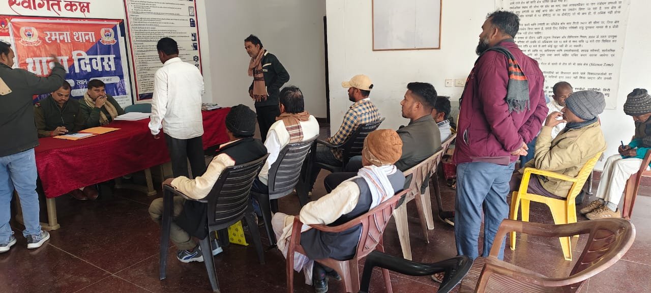 रमना थाना परिसर में मंगलवार को थाना दिवस का आयोजन किया गया। मौके पर अंचलाधिकारी विकास पांडेय व थाना प्रभारी आकाश कुमार ने लोगों की समस्याएं सुनीं। भूमि विवाद समेत तीन मामलों का ऑन द स्पॉट फैसला सुनाई गई। बाकी अन्य मामलों का निपटारा किया गया, जबकि अन्य मामलों के शीघ्र समाधान का भरोसा दिया गया।