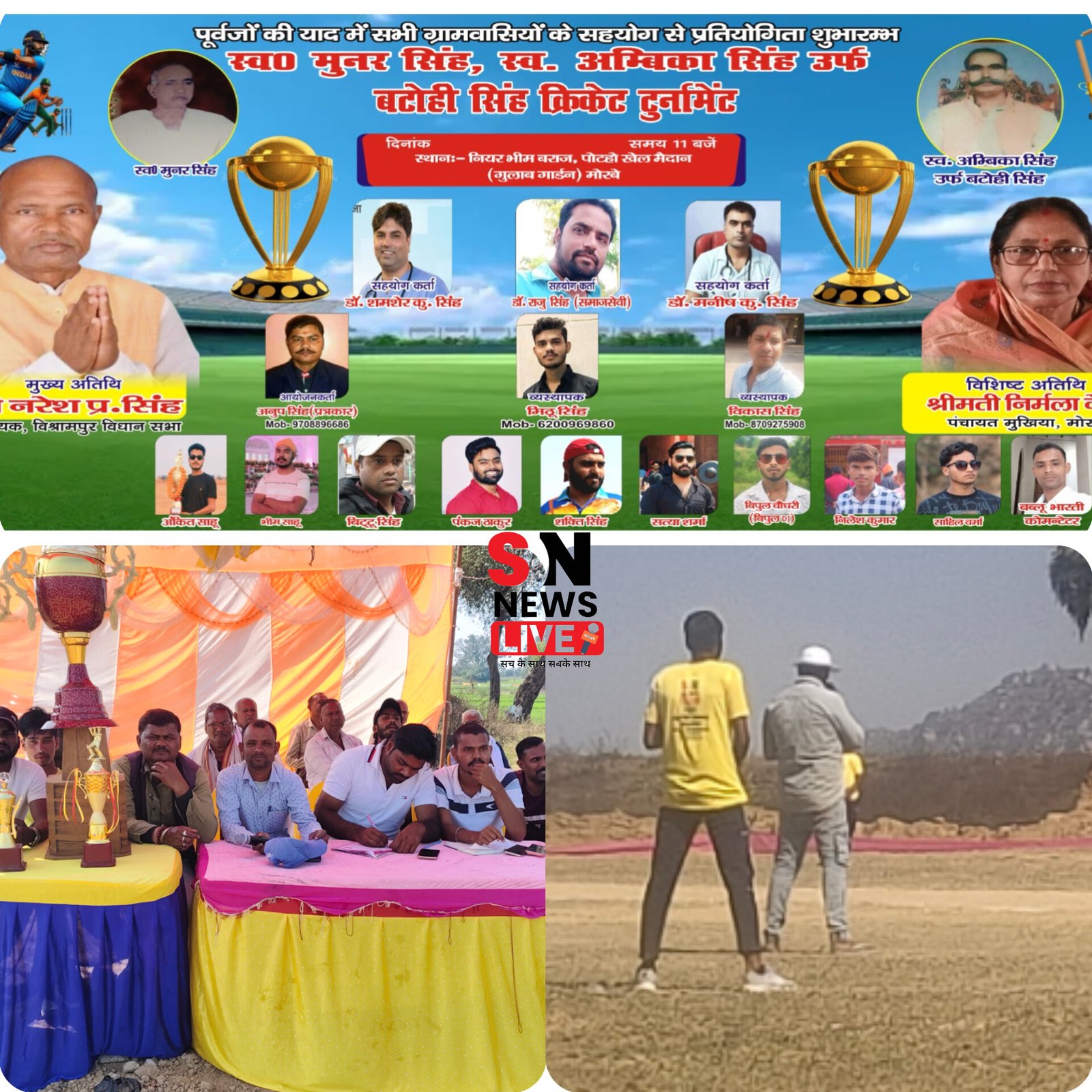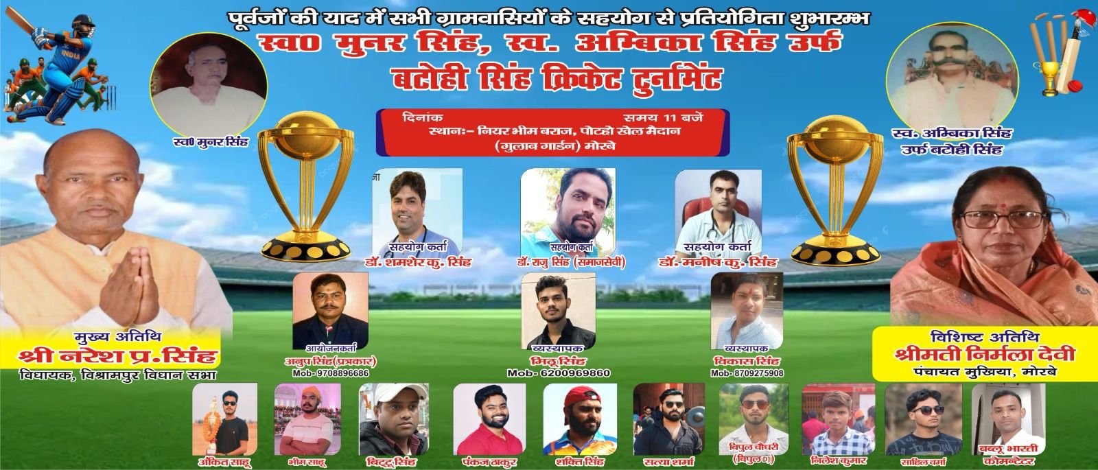 यह मैच डॉक्टर मनीष कुमार सिंह, डॉक्टर शमशेर सिंह, राजू सिंह, विकास सिंह, मिठू सिंह एवं ग्रामीणों के सहयोग से अनूप सिंह की देख-रेख में आयोजन किया जा रहा है। जिसका मुख्य अतिथि विधायक नरेश प्रसाद सिंह विश्रामपुर विधायक, विशिष्ट अतिथि निर्मला देवी पंचायत मुखिया मोरबे एवं अन्य गणमान्य लोगों की गरमामई उपस्थिति में खेलाया जाएगा।अनुप सिंह ने बताया कि इस क्रिकेट टूर्नामेंट मैच को देखने के लिए पलामू एवं गढ़वा के विभिन्न गांवों से लोग काफी दूर-दूर से आते हैं, और फाइनल मुकाबले के दिन डांसर भी रहेंगे और चौके , छक्के सहित अन्य समय में अपना डांस प्रस्तुत करेंगी। इस टूर्नामेंट में कॉमेंटेटर बबलू भारती एवं अंकित, भीम, सत्या, राजू सिंह,सक्ती , विपुल सहित अन्य सदस्यों का अहम योगदान दिया जा रहा है।